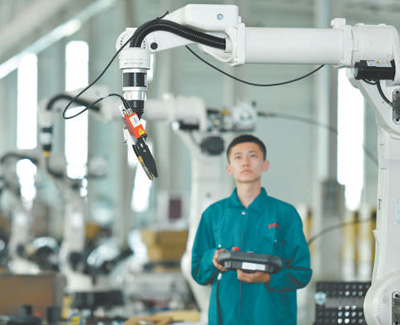 河北省任丘市通過搭建科技創(chuàng)新平臺,建設(shè)研發(fā)中心、技術(shù)研究院,持續(xù)深化產(chǎn)學(xué)研合作交流,推動企業(yè)轉(zhuǎn)型升級。圖為工作人員在生產(chǎn)車間調(diào)試機(jī)器人。
