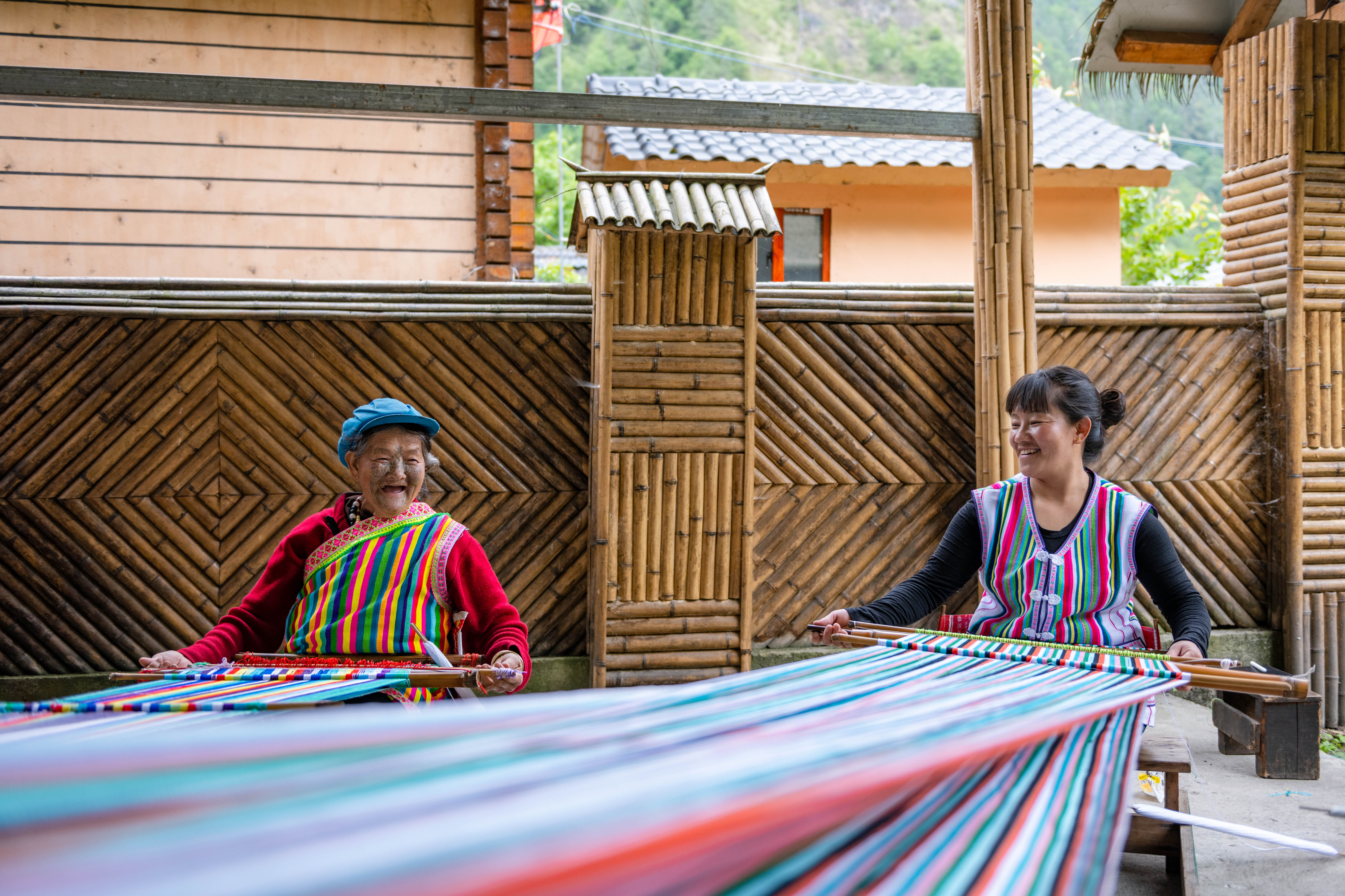 在云南省貢山獨龍族怒族自治縣獨龍江鄉(xiāng)迪政當村,獨龍族老人李文仕(左)和女兒在編織獨龍?zhí)海?022年5月10日攝)。新華社記者 曹夢瑤 攝