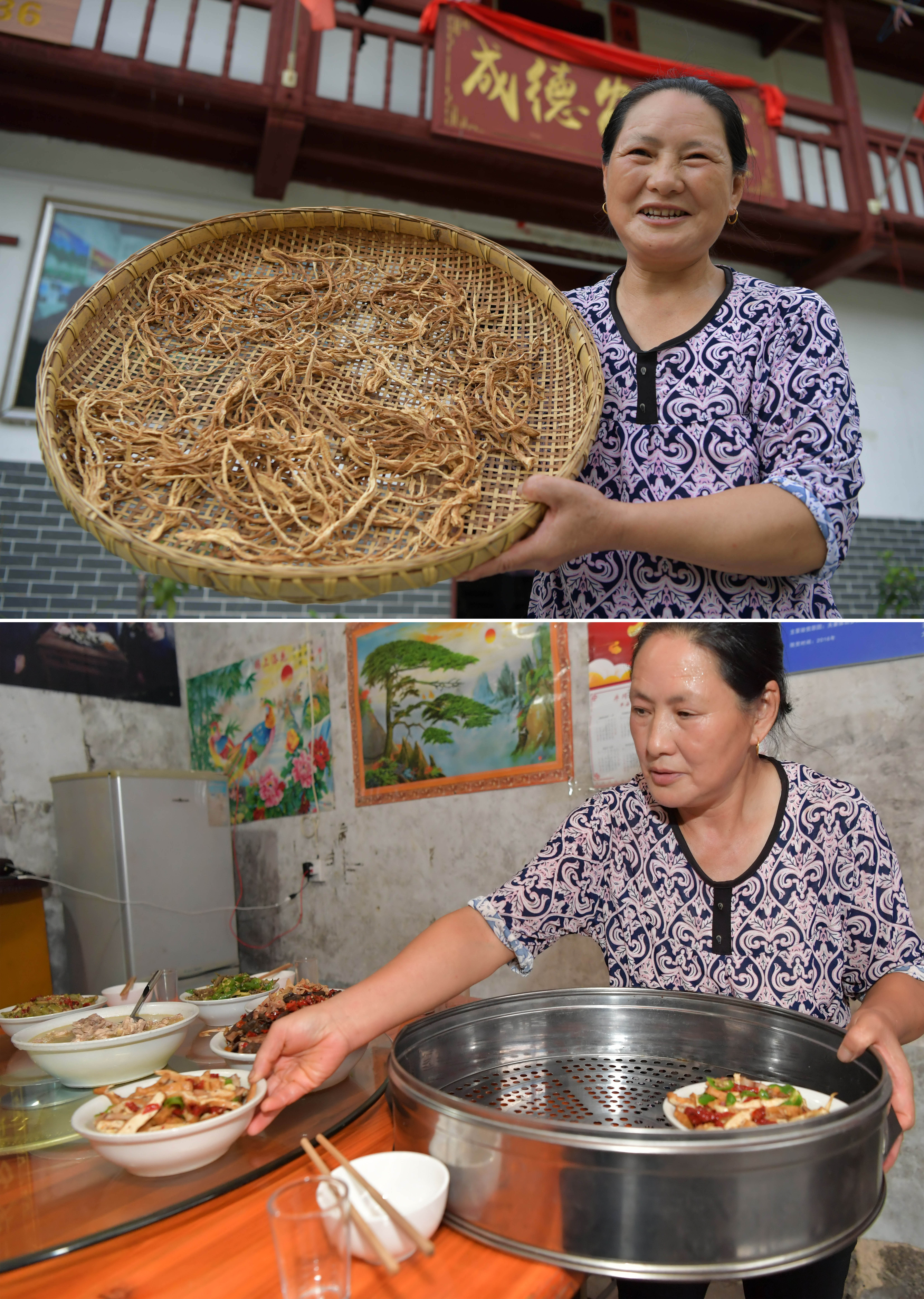 拼版照片:上圖為江西省井岡山市神山村村民彭夏英在自己開辦的農(nóng)家樂內(nèi)展示她家自制的當?shù)靥禺a(chǎn);下圖為彭夏英在農(nóng)家樂內(nèi)給顧客上菜(2020年7月15日攝)。新華社記者 彭昭之 攝