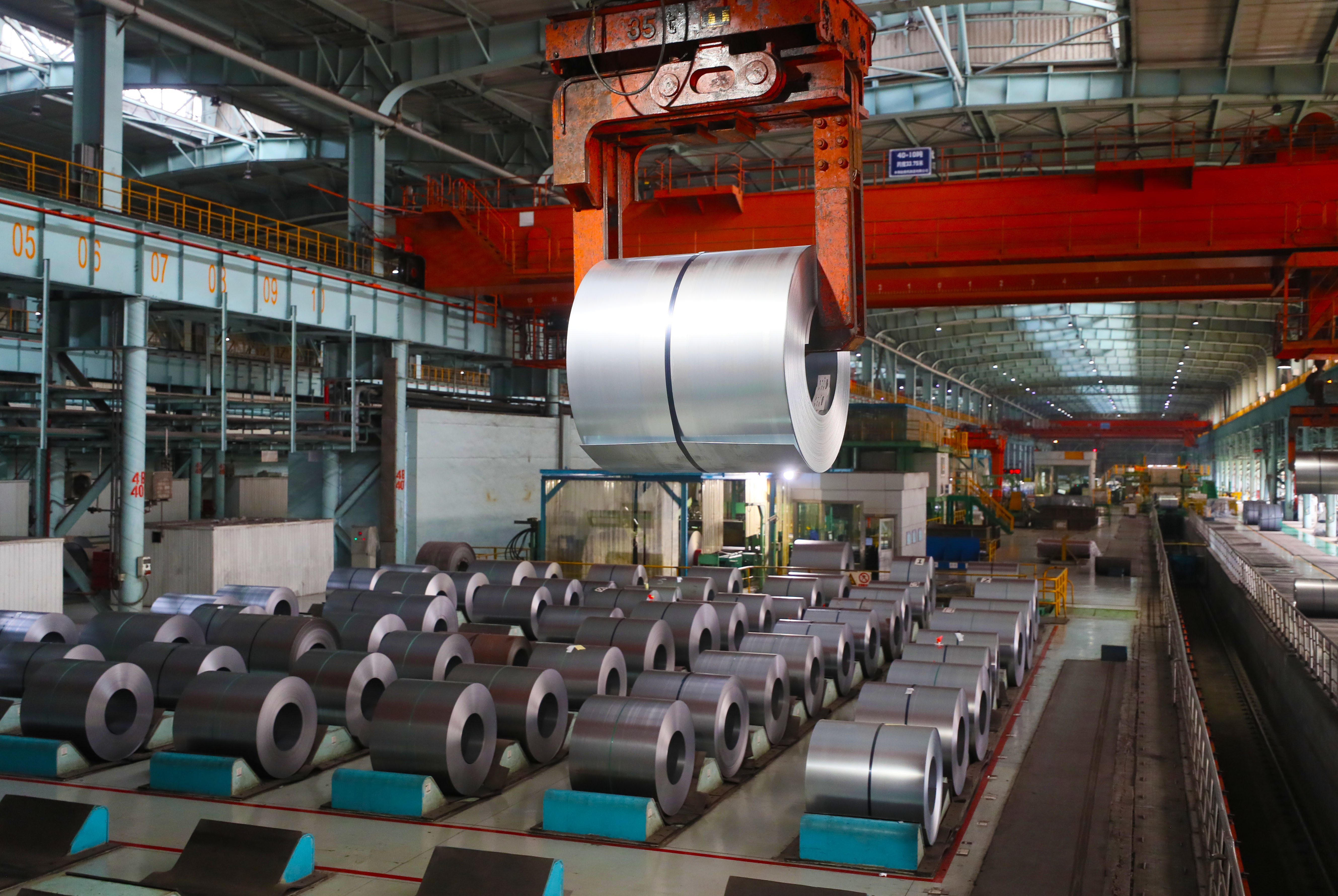 在遼寧本鋼冷軋廠,吊車在吊裝鋼卷(2021年8月18日攝)。新華社記者 楊青 攝