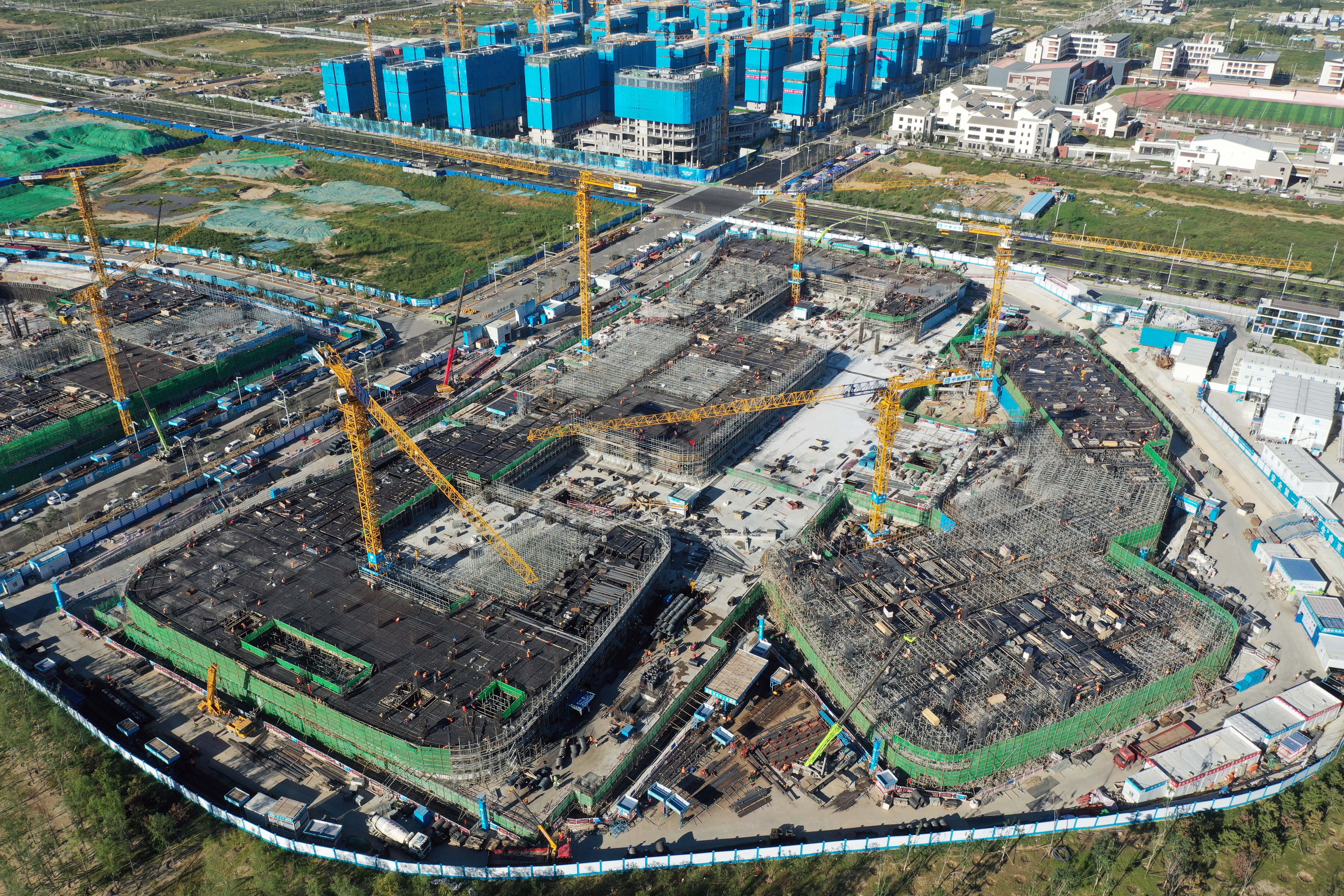 位于雄安新區(qū)啟動區(qū)的中國星網(wǎng)雄安新區(qū)總部大樓建設施工現(xiàn)場(2022年9月7日攝,無人機照片)。新華社記者 朱旭東 攝