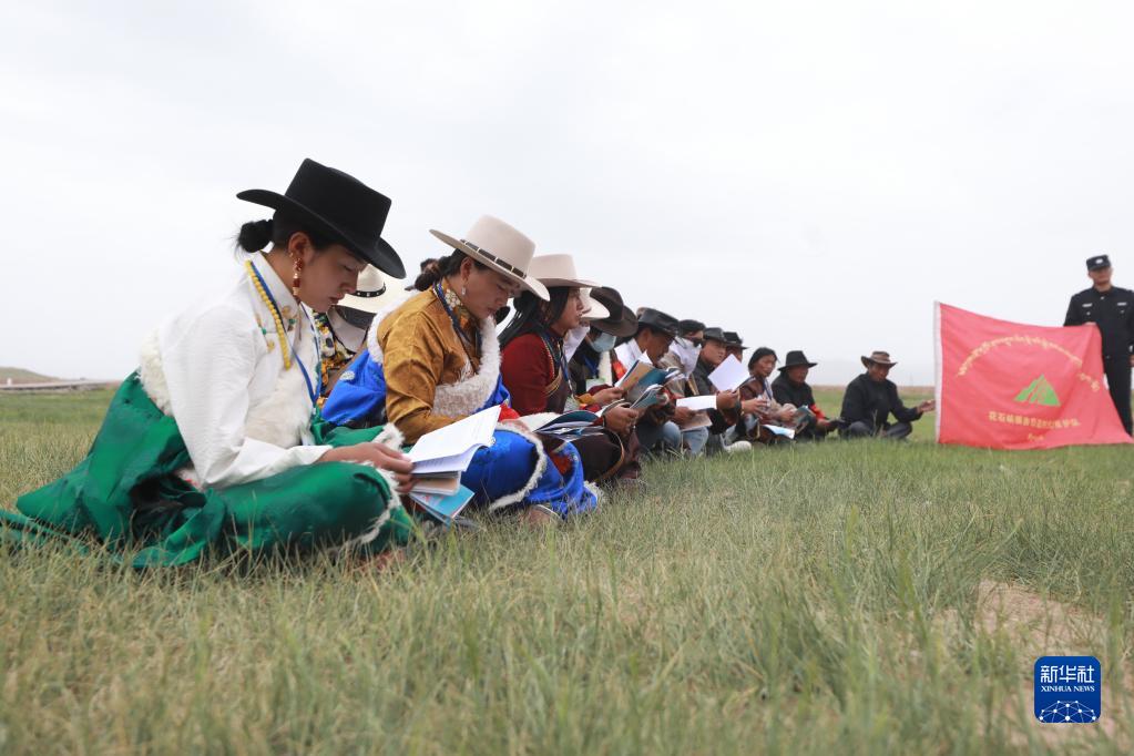 2022年7月12日,在瑪多縣花石峽鎮(zhèn)吉日邁村,瑪多縣人民法院立案庭庭長(zhǎng)才偵措(中)在開(kāi)展環(huán)境保護(hù)相關(guān)法律宣傳。新華社發(fā)