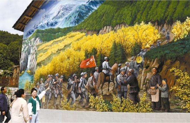 佛坪縣長角壩鎮(zhèn)沙窩村講解員站在大型墻畫前向游客講述紅軍長征駐扎沙窩村的故事。 通訊員 吳彥峰攝