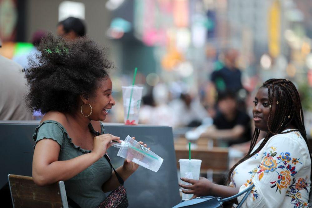 2018年7月2日,在美國(guó)紐約市時(shí)報(bào)廣場(chǎng),人們喝水休息。(新華社記者王迎攝)