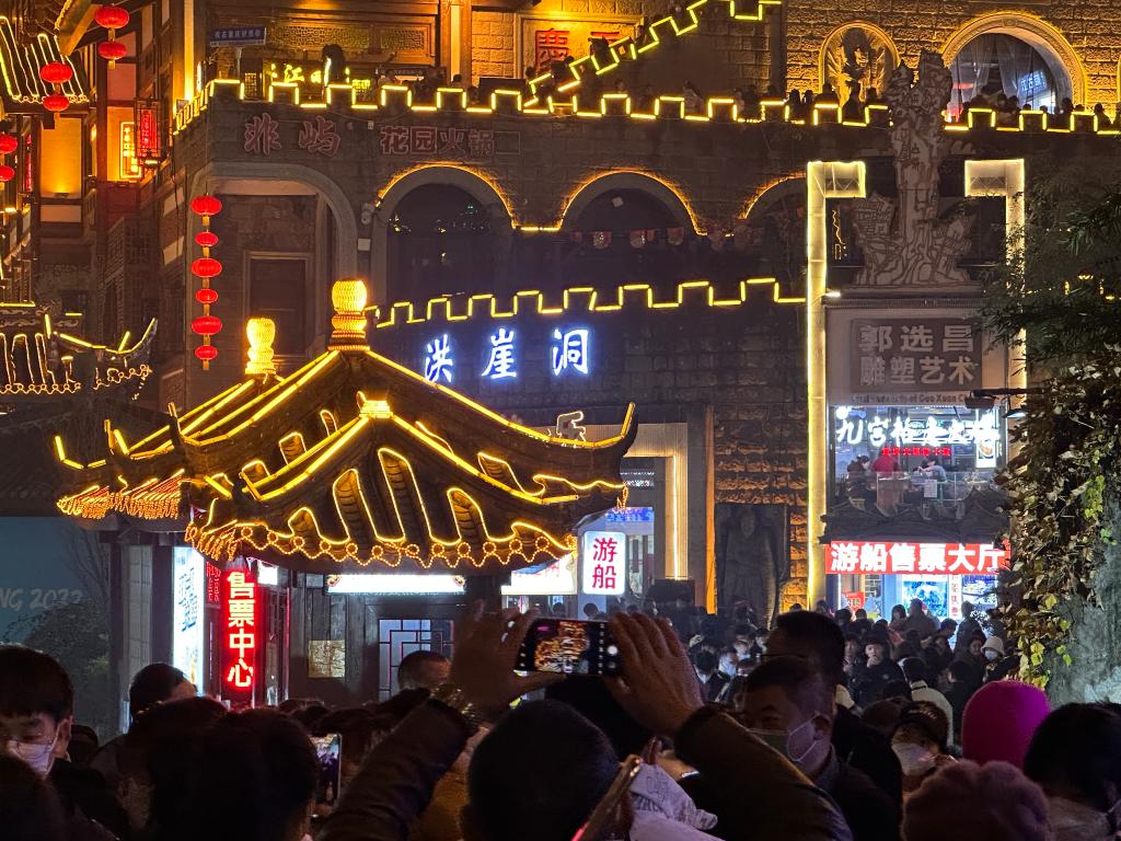 重慶洪崖洞民俗風(fēng)貌區(qū)重現(xiàn)歡鬧,“店鋪營業(yè)額同比增長20%。”一家火鍋店店主陳大江說;重慶老街山城巷,紅燈籠照亮青石與黛瓦,人們在打卡地排隊拍照。“這里古色古香,又融入現(xiàn)代時尚元素,很有氛圍!”游客秦藝說。
