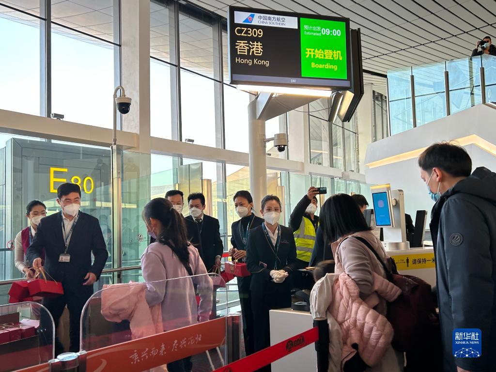 新華社北京1月17日電(記者羅鑫、吉寧)17日上午9時許,前往香港的CZ309航班搭乘100多名乘客騰空而起,中國“新國門”北京大興國際機場“暫停”近三年的國際及地區(qū)客運航班“重啟”,國際及港澳臺地區(qū)客運航線正式恢復。