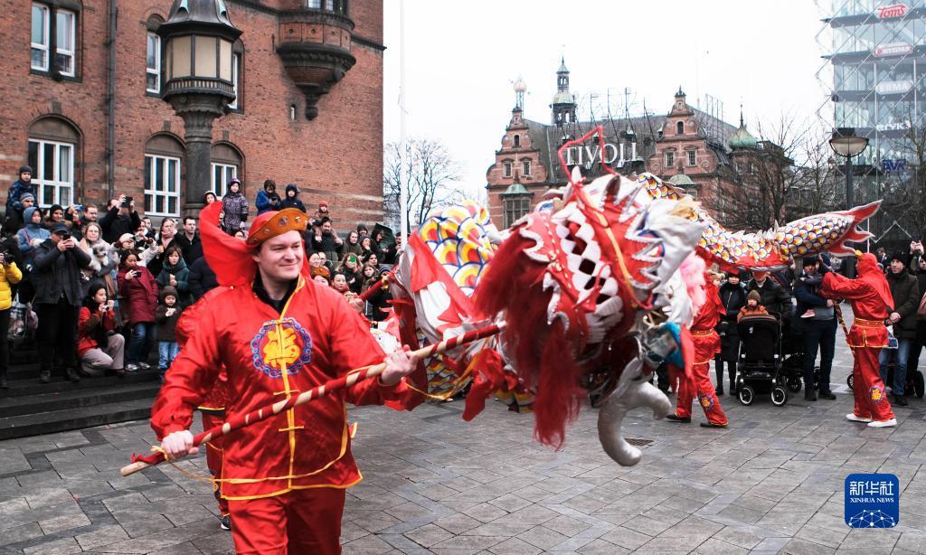 1月21日,人們在丹麥?zhǔn)锥几绫竟姓V場觀看舞龍表演。新華社記者 林晶 攝