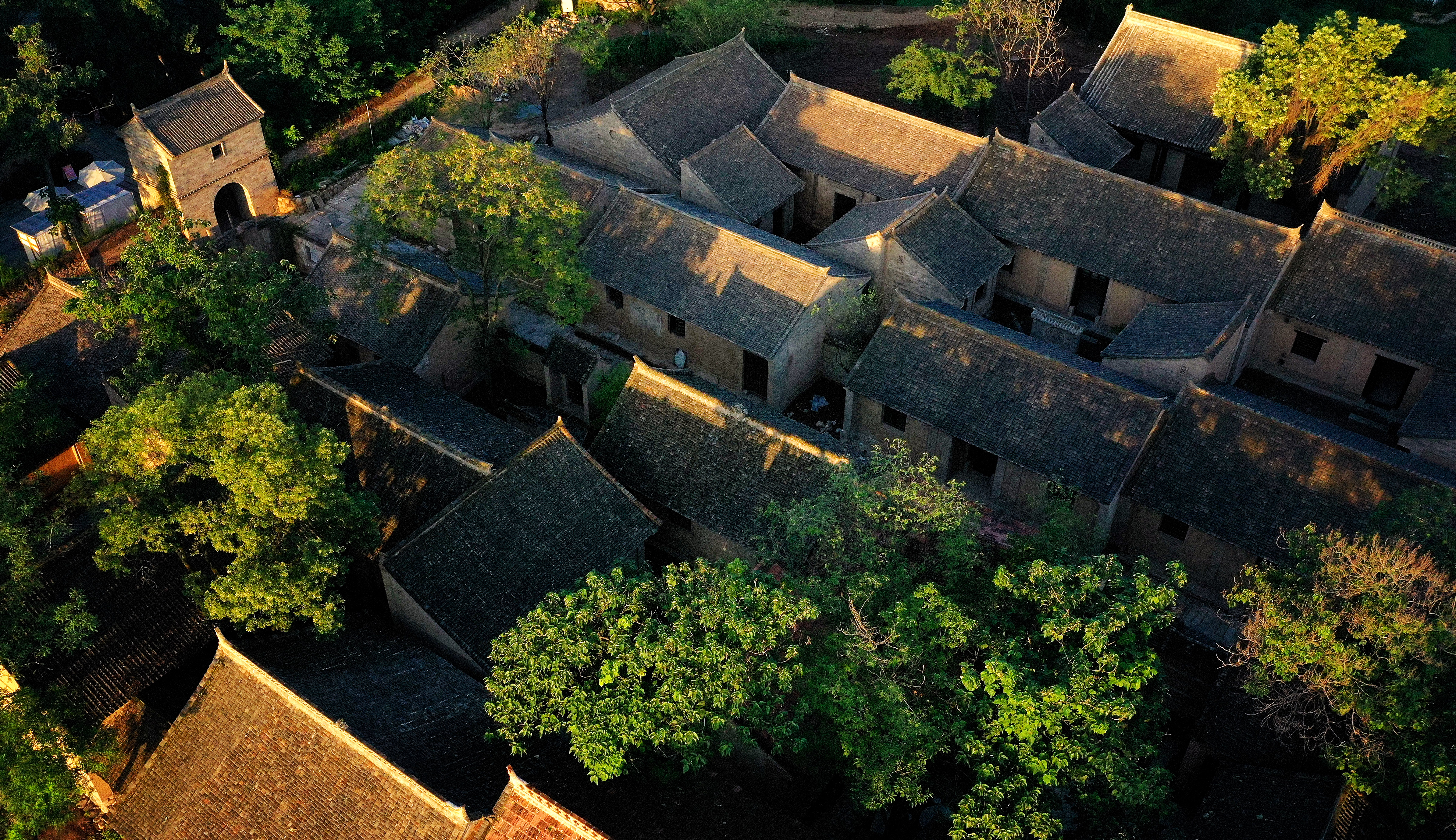 神禾塬上,萬象更新。油菜、麥田、稻田組成的無邊底色上,桃李簇擁,梅林入懷,一座古樸村寨躍然其上。分花拂柳步入其間,現(xiàn)今村落仍保留著關中傳統(tǒng)建筑的風貌和文化烙印——“終南為屏、滈河為脈、神禾為依、川囿為基、化龍為嶺、坡地成梯、平谷為田、循勢成林”。碧藍天幕下,終南山猶如錦屏般守護古村。