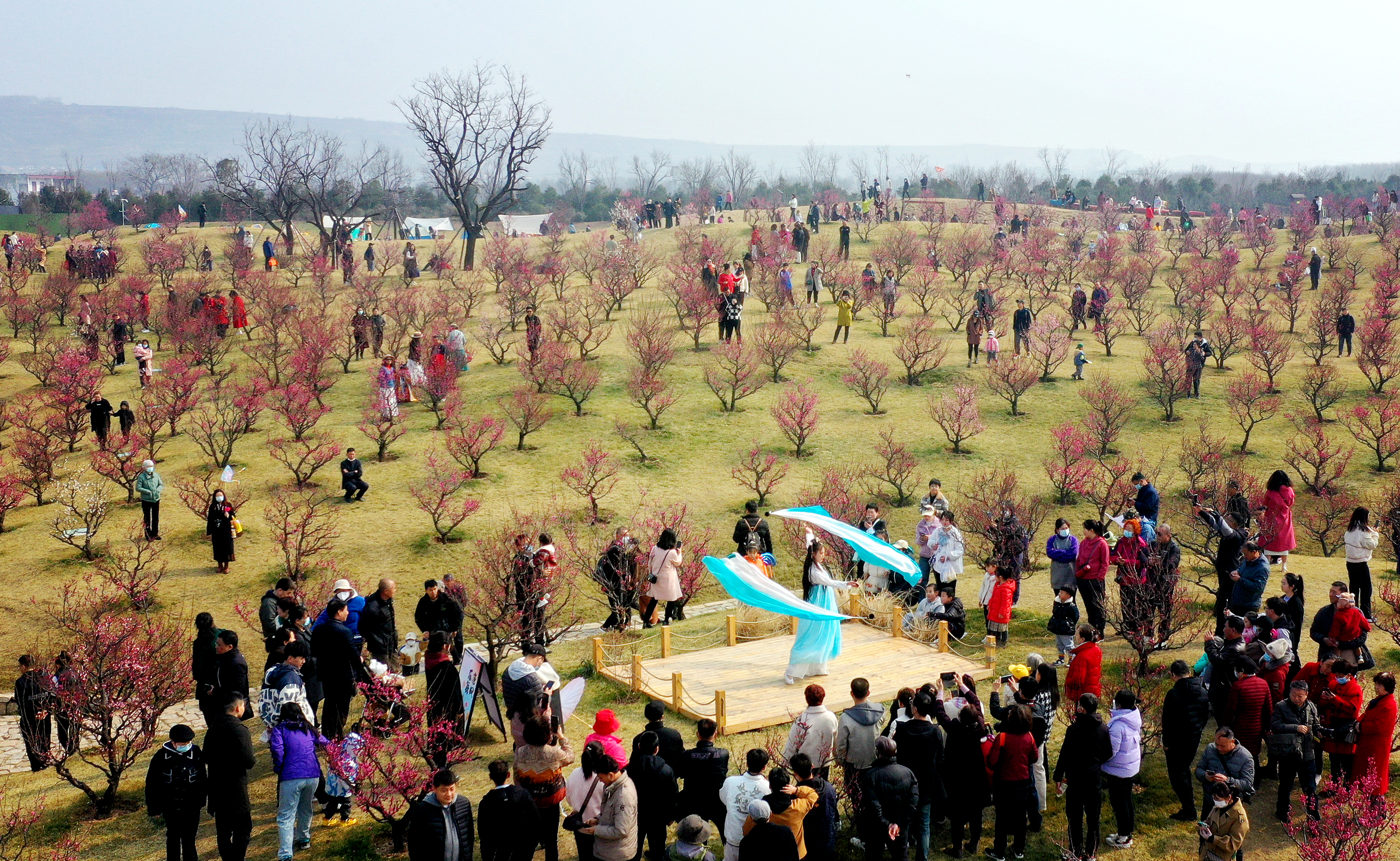 2月26日,游人在長安唐村梅園內(nèi)賞梅(無人機照片)。新華社記者 劉瀟 攝