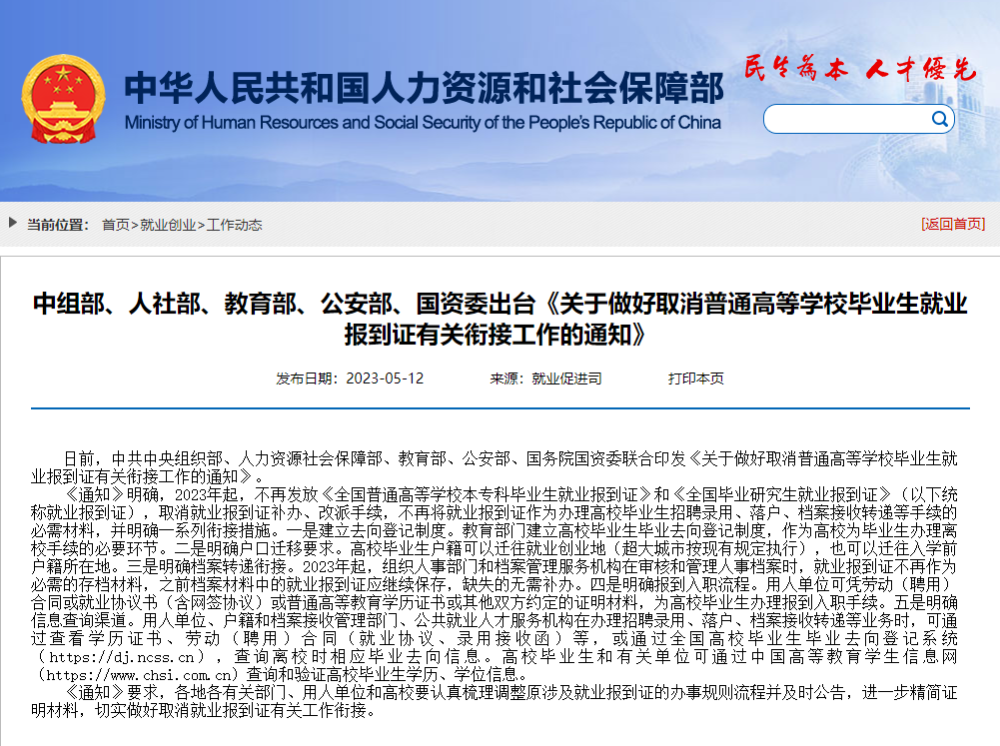 出臺《關(guān)于做好取消普通高等學校畢業(yè)生就業(yè)報到證有關(guān)銜接工作的通知》