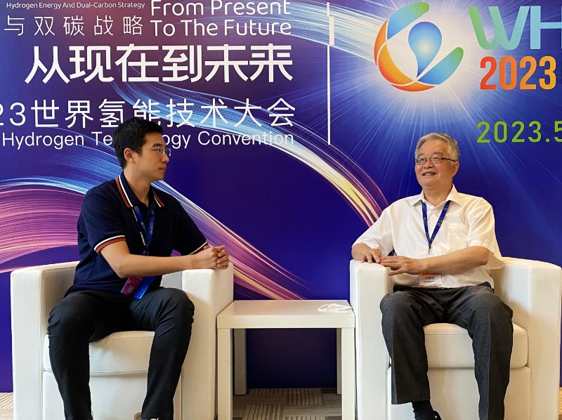 圖為國(guó)際氫能協(xié)會(huì)副主席毛宗強(qiáng)(右)接受新華網(wǎng)采訪