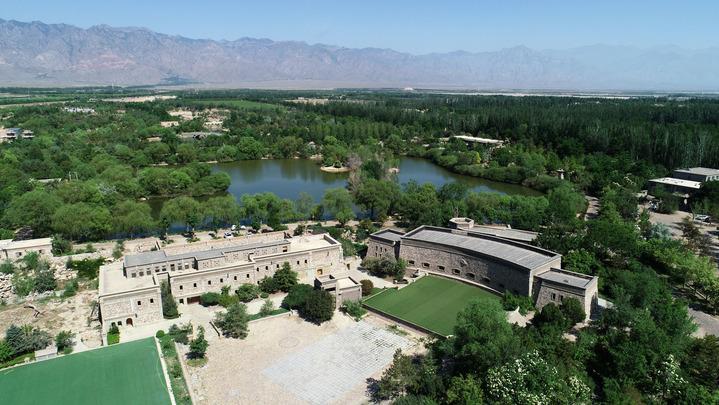 位于賀蘭山東麓的志輝源石酒莊(6月8日攝,無(wú)人機(jī)照片)。新華社記者 王鵬 攝