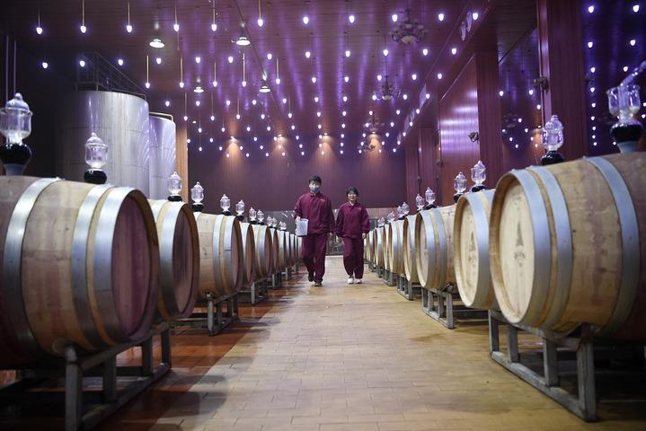 風(fēng)從賀蘭山深處吹來(lái),拂過(guò)山腳下一眼難望到頭的葡萄園。一座占地面積達(dá)5000平方米的酒窖里,自動(dòng)化設(shè)備保持四季恒溫恒濕,2000個(gè)橡木桶鱗次櫛比,國(guó)際葡萄酒大賽獲獎(jiǎng)證書一個(gè)挨著一個(gè),擺滿了十幾米長(zhǎng)的陳列架。