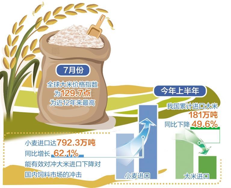 “為了確保大米進(jìn)口穩(wěn)定性,我國各類進(jìn)口主體也在推進(jìn)大米進(jìn)口多元化,避免來源地和品種過于集中帶來的進(jìn)口安全風(fēng)險(xiǎn)。”彭超說。一方面,推進(jìn)大米進(jìn)口來源地多元化。我國大米進(jìn)口來源地包括越南、緬甸、泰國、印度、巴基斯坦、柬埔寨等主產(chǎn)國。從去年10月起,我國開始逐步減少印度碎米進(jìn)口,印度已從過去幾年中國最大的大米供應(yīng)商滑落至第四位。另一方面,推進(jìn)糧食進(jìn)口品種多元化。減少大米進(jìn)口的同時(shí),增加飼用小麥進(jìn)口。今年上半年,我國小麥進(jìn)口量達(dá)到792.3萬噸,較去年同期增長62.1%,能夠有效對沖大米進(jìn)口下降對國內(nèi)飼料市場的沖擊。