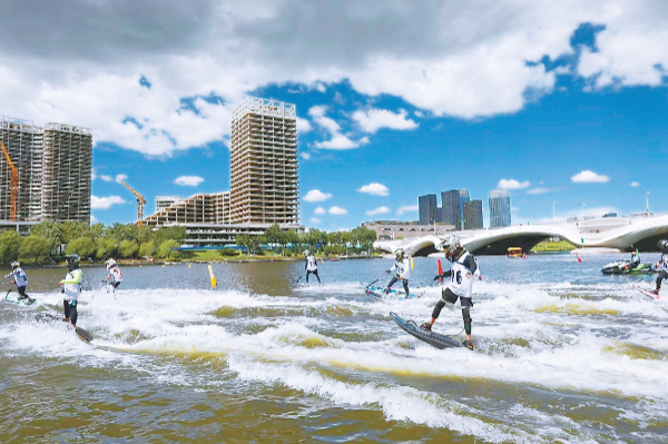 今年7月,2023年全國電動沖浪板聯(lián)賽(北京大運(yùn)河站)在北運(yùn)河開賽,這也是副中心在大運(yùn)河首次承辦國家級動力板聯(lián)賽?;顒蝇F(xiàn)場,參賽運(yùn)動員在風(fēng)景如畫的大運(yùn)河上踏浪飛馳,吶喊聲、歡呼聲在河兩岸此起彼伏,飛濺的浪花、激情的運(yùn)動、歡樂的人群,共同構(gòu)成了一幅炫彩、活力的運(yùn)河新圖景。