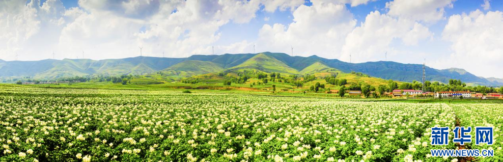 八月,青山環(huán)抱的黃土坡上,土豆花成團(tuán)成簇盛開(kāi),連成一片花海。