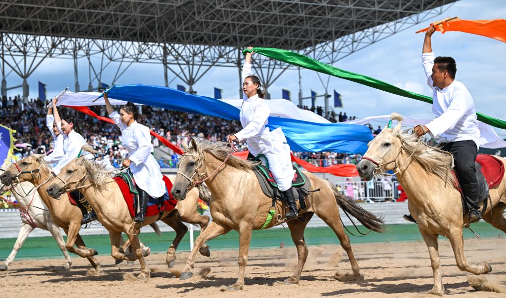 8月9日,2023興安盟那達(dá)慕在烏蘭毛都草原開(kāi)幕,這是演員在開(kāi)幕式上進(jìn)行表演。新華社記者 貝赫 攝