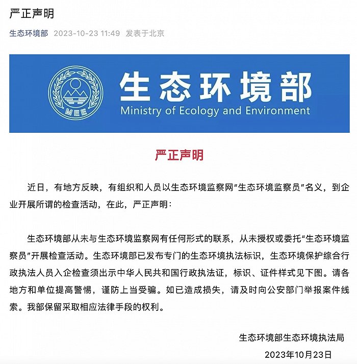 據生態(tài)環(huán)境部公眾號10月23日消息,近日,有地方反映,有組織和人員以生態(tài)環(huán)境監(jiān)察網“生態(tài)環(huán)境監(jiān)察員”名義,到企業(yè)開展所謂的檢查活動,在此,生態(tài)環(huán)境部嚴正聲明: