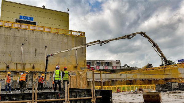 照此安排,項(xiàng)目部各部門、作業(yè)隊(duì)既各自為戰(zhàn),又協(xié)調(diào)統(tǒng)一,按區(qū)域、分專業(yè)、依先后齊頭并進(jìn)。筆者在地面施工區(qū)域看到,盾構(gòu)井臨時(shí)封堵板的鋼筋綁扎已經(jīng)完成,8名作業(yè)人員和監(jiān)理、技術(shù)人員在做最后的檢查,混凝土罐車、泵車嚴(yán)陣以待……不一會(huì)兒,混凝土順著管子就流向了鋼筋網(wǎng)內(nèi),4名振搗工也隨之開(kāi)始忙碌,嗡嗡聲響成一片。車站1號(hào)鋼筋場(chǎng),10幾名穿著印有“鋼筋工”“信號(hào)司索工”馬甲的工人,或協(xié)助吊車調(diào)運(yùn)鋼筋、或切割鋼筋原材下料;不遠(yuǎn)處,吊車調(diào)運(yùn)明挖段鋼支撐轉(zhuǎn)場(chǎng)……