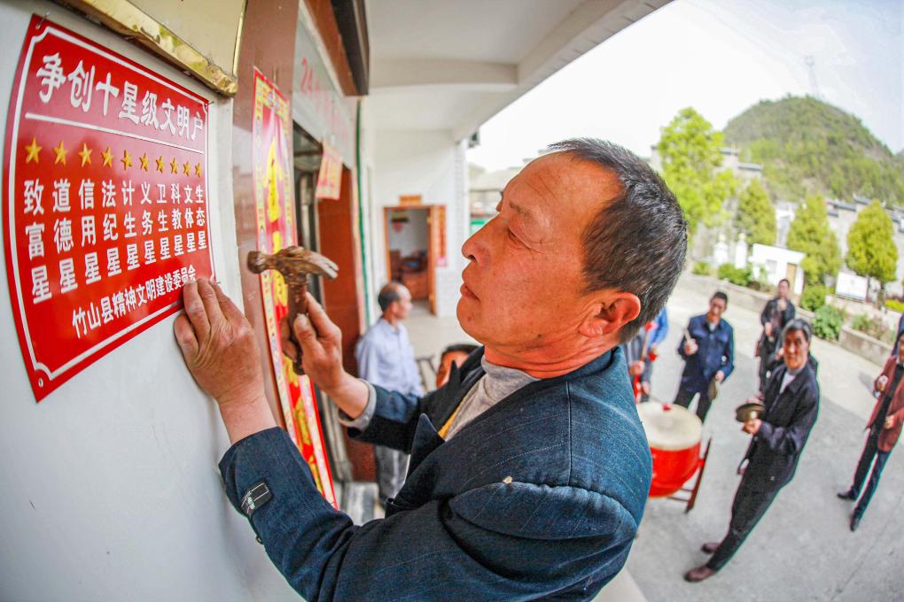 竹山縣城關(guān)鎮(zhèn)二道坊村村干部為“十星級(jí)”文明農(nóng)戶掛牌。(章磊 攝)