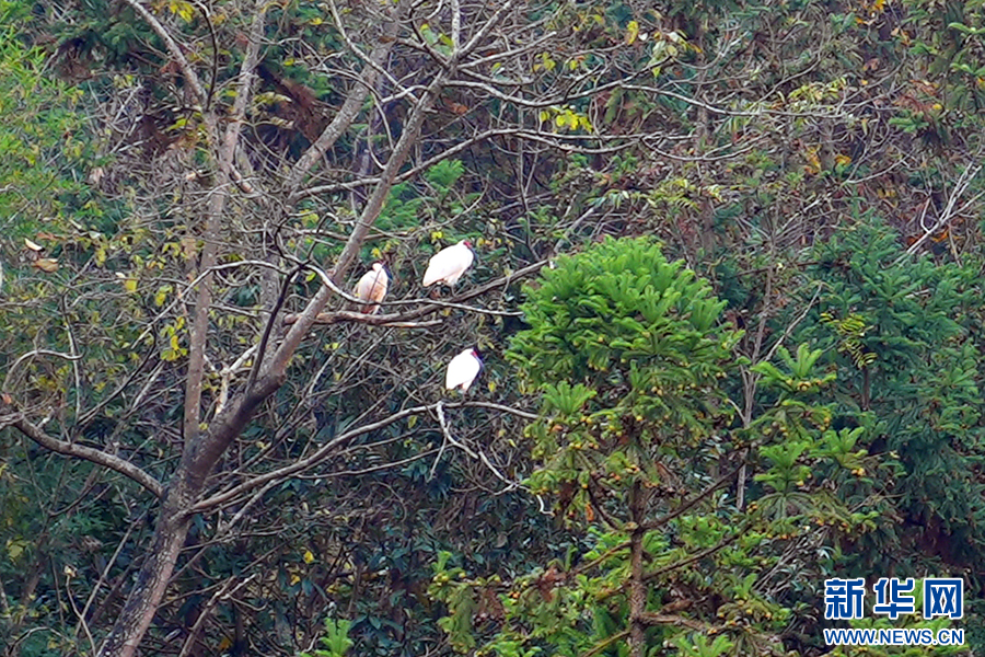 冬日,在石泉縣城關(guān)鎮(zhèn)絲銀壩村草池灣,3只朱鹮在樹(shù)上小憩。新華網(wǎng) 楊喜龍 攝