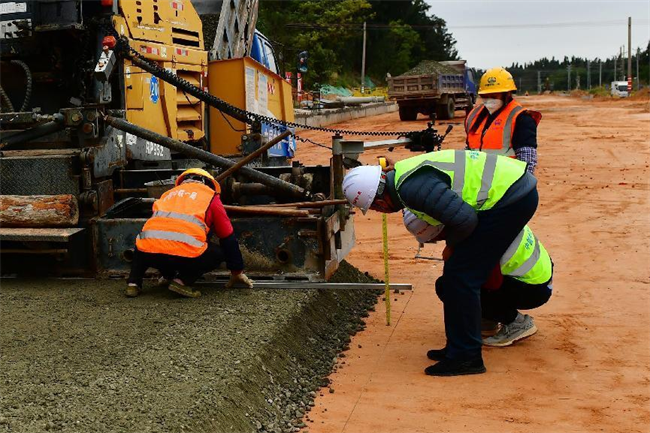筆者在現(xiàn)場(chǎng)看到,運(yùn)輸車將水穩(wěn)料緩緩倒入攤鋪機(jī)料斗里,2名司機(jī)開(kāi)著攤鋪機(jī)緩緩前行,現(xiàn)場(chǎng)管理人員和作業(yè)人員互相配合,不時(shí)測(cè)量著攤鋪厚度……攤鋪到了50米左右,壓路機(jī)開(kāi)始進(jìn)行碾壓作業(yè)……
