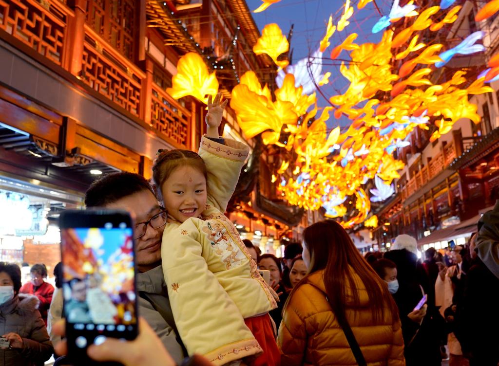 2023年12月30日,人們在上海豫園商城觀燈拍照。新華社記者 劉穎 攝