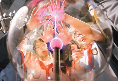 學(xué)生們在廣東科學(xué)中心觀察和體驗(yàn)“輝光球”放電現(xiàn)象。黃繼明攝(人民圖片)
