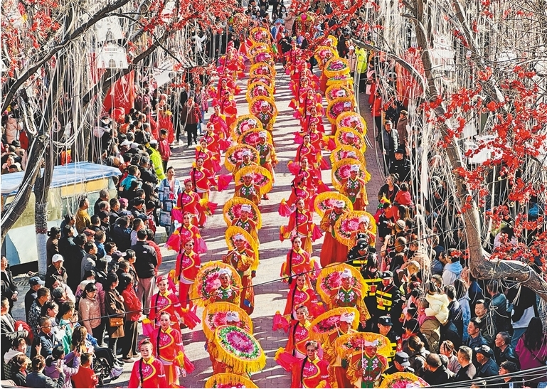 2月13日,全國秧歌展演活動在榆林市拉開帷幕。圖為游客在榆林古城大街觀賞秧歌表演。記者 孫丹攝