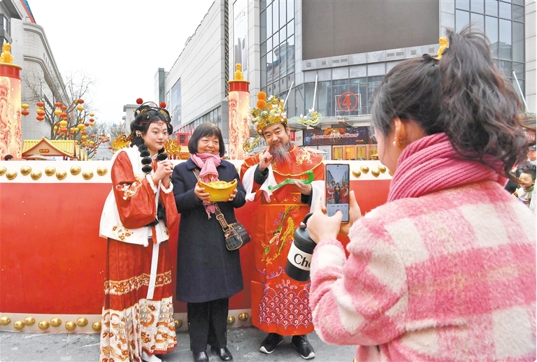 2月14日,西安市新城區(qū)“皇城里·民樂園首屆新春文化節(jié)”現(xiàn)場熱鬧非凡,“請財神”、耍社火等民俗表演輪番上演。圖為市民與“財神”合影留念。 記者 蒲茜攝