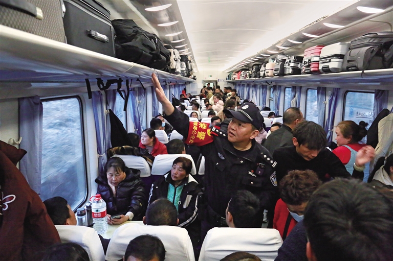 2月14日,安康鐵路公安處值乘民警袁勇在K4136次列車車廂開展隱患排查。 通訊員 郝黎俊攝