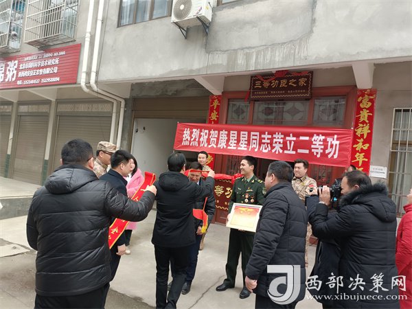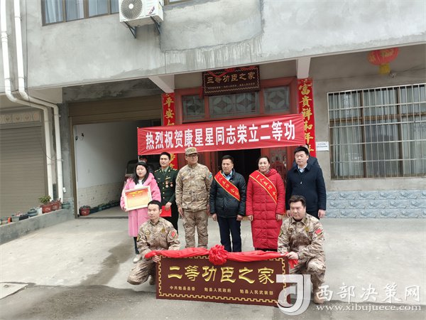 西部決策網(wǎng)訊  “咚咚鏘,咚咚鏘......”伴隨著喜慶歡快的鑼鼓聲,2月29日,縣委統(tǒng)戰(zhàn)部惠亞朋部長、縣武裝部曾海龍帶領縣退役軍人事務局、定軍山鎮(zhèn)人民政府、元墩鎮(zhèn)人民政府、高寨社區(qū),聯(lián)合為在部隊榮立“二等功”的康星星及家屬登門送上立功喜報和二等功牌匾及慰問金,讓軍屬共享這份榮耀和喜悅。