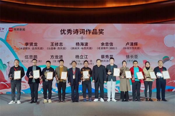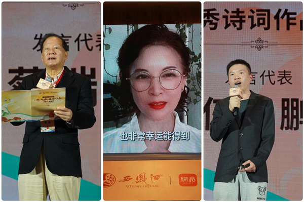 會(huì)上,王士祥、李曉東分別作了題為《詩詞山河—古典詩詞與酒》《當(dāng)代生活與傳統(tǒng)詩詞》的主題演講;網(wǎng)易文化高級(jí)主編章劍鋒公布比賽情況,與會(huì)領(lǐng)導(dǎo)為獲獎(jiǎng)詩詞作品頒獎(jiǎng);獲獎(jiǎng)代表蔡瑞義、鐘婉、伍思鵬分別作了發(fā)言;獲獎(jiǎng)作品進(jìn)行了現(xiàn)場(chǎng)表演展示。