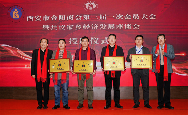西安市合陽(yáng)商會(huì)會(huì)長(zhǎng)賈申龍先生和監(jiān)事長(zhǎng)劉自力先生為副會(huì)長(zhǎng)單位授牌。