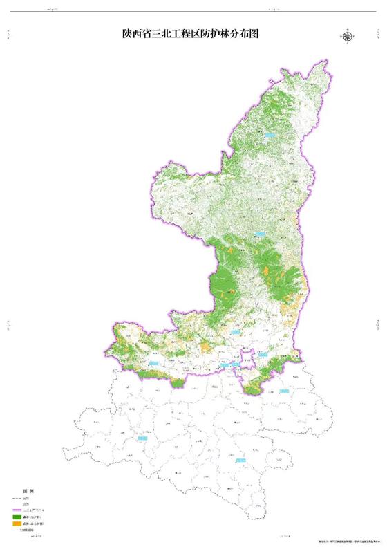 “三北工程”是“防護林”工程,也是中國生態(tài)文明建設(shè)的重要標(biāo)志性工程。1978年11月25日,國務(wù)院批準實施三北防護林體系建設(shè)工程(簡稱“三北工程”),規(guī)劃期由1978年到2050年,規(guī)劃區(qū)總面積65億畝。“三北工程”是人類最具雄心的生態(tài)工程。陜西是“三北工程”之省,秦嶺以北的黃河流域,包括秦嶺北麓、關(guān)中平原、渭北旱塬、丘陵溝壑、毛烏素沙地,皆是“三北工程”區(qū)。陜西“三北工程”區(qū)總面積1.83億畝,占全省土地面積的59.29%、占全國“三北工程”區(qū)面積的2.8%。